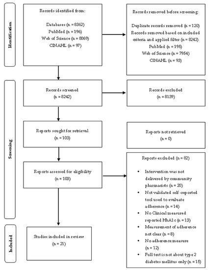 PubMed/Medline, Web of Science, and CINAHL between 2010 and 2020. The keywords “type 2 diabetes”, “therapeutic adherence” and “pharmacist” were used, combined with the Boolean operator “AND”. The references from all the electronic searches were downloaded into EndNote X7 reference manager. The detailed search strategy is given in Appendix A.