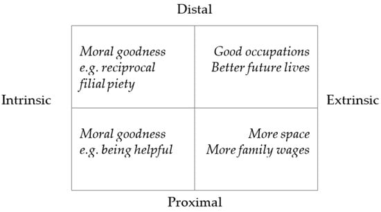 The children in this study showed a range of low to high aspirations for the future. The moderate and high aspirations of the children can generally be viewed in two dimensions: intrinsic or extrinsic nature, and short or long term. Extrinsic aspirations refer to aspirations that are concerned with getting out of poverty, while intrinsic aspirations refer to those that refer to becoming morally altruistic, such as being helpful, being filial or reciprocal, and contributing to society. Moreover, some aspirations, such as career aspirations, are long-term achievements, while other aspirations, such as helping people, can be achieved within a shorter period of time. The sophistications of children’s aspirations can be seen in Figure 1.