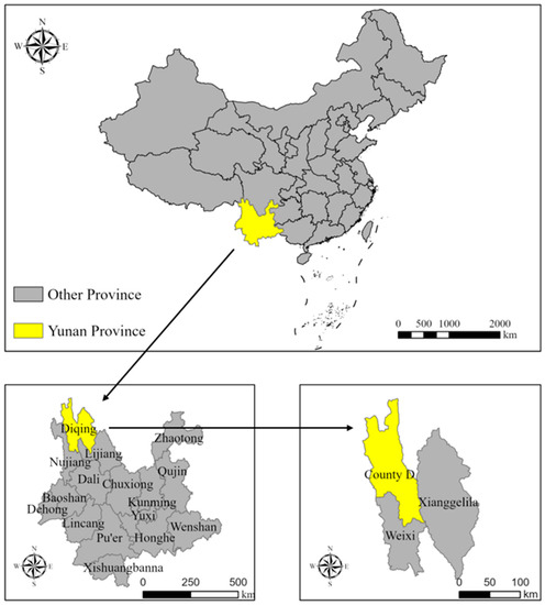County D, in Diqing Tibetan Autonomous Prefecture in Yunnan Province, is located between 98°3′56″–99°32′20″ E and 27°33′44″–29°15′2″ N in the Hengduan mountain range in the northwestern part of Yunnan Province. There are two towns and six townships in County D, with a total area of 7291 square kilometers and a population density of eight people per square kilometer. S Town, the county capital, is located at 3400 m above sea level; it is 182 km from Shangri-La, the state capital, and 889 km from Kunming, the provincial capital. Since ancient times, S town has presented an intersection of Chinese and Tibetan cultures, served as the ‘foreign market center’ along the southwestern Tea Horse Road, and operated as the Tibetan-Chinese trade and cultural distribution center. It is known locally as the ‘snow mountain foreign market’. S town is an important transportation hub from Yunnan to Sichuan and Tibet and occupies a special strategic location for political, economic, and cultural communication between Yunnan, Sichuan, and Tibet. It is also the political, economic, and cultural center of County D. S town is one of the main settlements of ethnic minorities. Major ethnic groups include the Tibetan, Han, Hui, and Naxi. It is also a typical multi-religious area, including Tibetan Buddhism, Catholicism, and Islam, among others. Due to a complex geological structure, this area is prone to geological disasters such as landslides and mudslides and it is one of the key target areas for geological disaster prevention and control [71]. The disaster-preventive migration in focus involved two communities and one village in S town of County D, comprising more than 1700 households and approximately 6000 people (Figure 1).