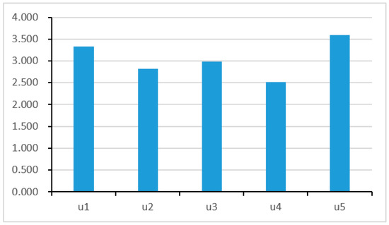 In the fourth step, the fuzzy judgement matrices and of and , respectively, were determined. In this study, the fuzzy judgement matrices were determined using fuzzy assessment methods based on the experts’ weights [74] by considering differences in the education level, cultural background, and familiarity with the assessment items of the experts. For the second-level risk factors, the weights of T experts were assumed to be and . The weight of one expert evaluating factor as was denoted as ; then, the weight of the factor being evaluated as () was: . The membership of the evaluation factors to the evaluation result in the evaluation set was , where was the sum of all expert weights. After calculating the memberships of all factors of using the aforementioned method, the fuzzy judgement array of the second-level risk factors was obtained, as follows:
