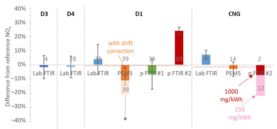 The relative final emissions differences of each instrument from the laboratory reference CLD analyzers are summarized in Figure 5, separately for each engine. The mean differences were in most cases within ±10%, with some cases reaching ±25%. The 20% underestimations with PEMS and the portable FTIR #2 were explained in Figure 2b and Figure 3b, respectively (drift and interference offset). For engines D1 and CNG, many instruments were available and the mean value of all instruments was very close to the reference laboratory analyzers, as shown by the red dashed line.