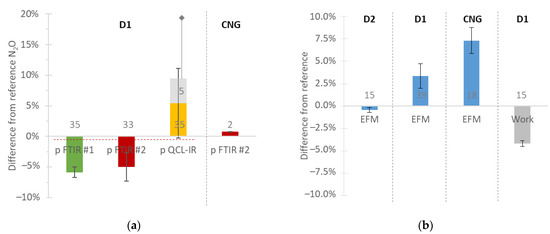 Figure 9a summarizes the available results, with instruments measuring N2O. The mean differences were within ±5% for emissions ranging between 30 mg/kWh and 190 mg/kWh. The laboratory FTIR was considered as the reference. Even when considering the error bars, the differences were within ±10%. The only exceptions were five tests which had an offset of 1 ppm, probably due to wrong calibration, resulting in a difference of 20%. To put the results into context, in the USA, the N2O limit is 0.10 g/bhp-h (134 mg/kWh).