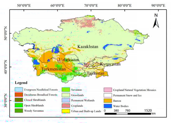 Map of study area. The land cover data was adapted from 500 m Moderate Resolution Imaging Spectroradiometer (MODIS) land cover product (MCD12Q1).