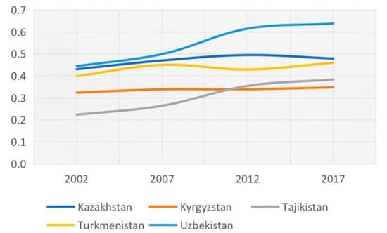We ranked the final scores by country and year to get the change in the level of sustainable agricultural development in each country. As shown in Figure 2, the composite scores of sustainable agricultural development in Central Asia from high to low are Uzbekistan, Kazakhstan, Turkmenistan, Tajikistan, and Kyrgyzstan. Uzbekistan showed a marked upward trend, while Kazakhstan, Turkmenistan, and Kyrgyzstan witnessed no significant change over the 15 years from 2002 to 2017.