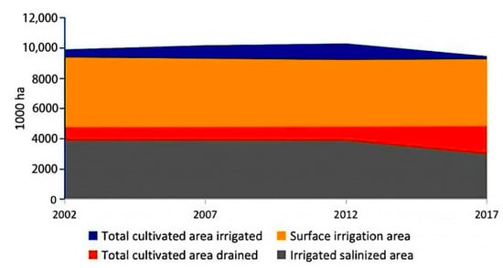 The irrigation and drainage system is the core of agricultural operations in Central Asia, which, in fact, does not work well [,,,,,,] and is extremely inadequate, with enormous water losses (up to 60%) in transportation []. In addition, the construction of irrigation and drainage systems is progressing slowly (Table S3). Most of the land is surface irrigated, and only half of the irrigated land is equipped with drainage systems (Figure 3). Poor irrigation and drainage systems lead to the downward spiral of land quality in agricultural practices. For instance, irrigation water for agriculture in Turkmenistan is mainly transported through the Karakum Canal, starting from the Amu Darya in the east. However, due to lack of refined management, the Karakum Canal experiences sediment accumulation and clogged drains. Because of the absence of anti-seepage protection and drainage facilities, the flow of salts and minerals between water and farmland soil became unrestricted, causing soil and water pollution. The infiltration of river water and the retention of irrigation water lead to the rise of groundwater level in farmland, which raises salt concentration in the soil surface and aggravates soil salinization [,]. In Uzbekistan, the system for collecting and disposing used irrigation water has collapsed, with unhardened surface drainage system playing a leading role. This unsound water supply and drainage system continuously result in a large amount of high-salinity irrigation water leaking into the ground, which accumulates in the shallow middle soil, eventually worsening the physical and chemical properties of soil year by year [].