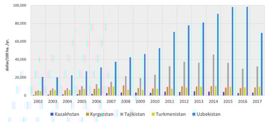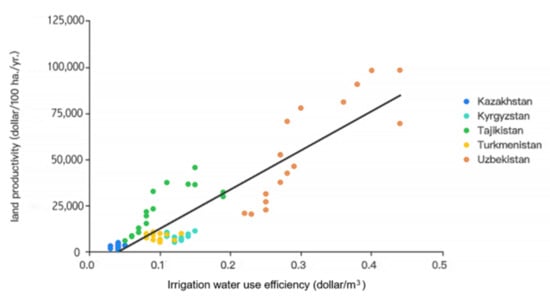 In fact, water and soil efficiency in Central Asia show surprising convergence (Figure 5), making it hard to separate the water and soil issues in Central Asia. Due to the unreasonable use of irrigation water, saline-alkali desertification explains how soil quality declines, and efforts should be intensified to mitigate salinization in Central Asia (Figure 3). Irrigation drainage water, thick with salts, fertilizers, and pesticides, is directly discharged into river, resulting in water pollution. Because of the large-scale withdrawal of water for agricultural irrigation, the water flow from the Amu Darya and Syr Darya into the Aral Sea has plummeted, causing the Aral Sea to shrink. Consequently, drying up of the Aral Sea has led to the formation of large territories of open sea bottom, which fuels the development of powerful sand and salt storms. A conservative estimate of 70 million tons of salt is taken away from the Aral Sea Basin and deposited on 150 to 200 million km2 of land annually, severely damaging farms []. Water flow is the main driving force for the transportation of salt in Central Asia. Irrigation water not only leaches inorganic salts from deep soil to the surface layer where the plant roots grow but also brings out the salt and chemical substances from the soil with the river water, resulting in secondary pollution and aggravation of the salinization of land. Comparison of the salt inflow and outflow indicates that salt increases from 0.6 to 10 t/ha per year in the middle and lower reaches of the Amu-Darya Basin. The largest part of salt-affected soil and saline water exists in the lower reaches of Amu Darya and Syr Darya Basins, where salinity is one of the main factors threatening food production [].