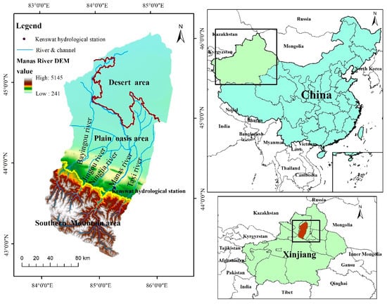 The Manas River Basin is located in the hinterland of the Eurasian continent, and it is a typical arid zone in northwest China. The basin is located at the northern foot of the Tianshan Mountains in Xinjiang and at the southern edge of the Junggar Basin, with approximate geographical coordinates of 43°27′–45°21′ N and 85°01′–86°32′ E []. The administrative divisions included in the basin mainly comprise 10 cities and counties, including Shihezi City, Manas County, Shawan County, and Bursek Mongol Autonomous County. The basin has an area of about 3.4 × 104 km2 and it contains six rivers, including the Manas River, Bayingou River, and Jingou River []. The Manas River Basin has a typical temperate continental arid climate, which is characterized by aridity, low rainfall, and high-intensity evaporation, with an average annual temperature of around 5.9 °C, average annual precipitation of 100–200 mm, and average annual evaporation of 1500–2100 mm. The topography of the basin is characterized as high in the east and low in the west and high in the south and low in the north, and the altitude varies significantly, from 241 m to 5242 m. The basin is divided from south to north into the southern mountainous region, oasis plain region, and desert region, where the southern mountainous region is the water production area, the plain region is the agricultural production area, and the desert region is the water dissipation area (Figure 1).