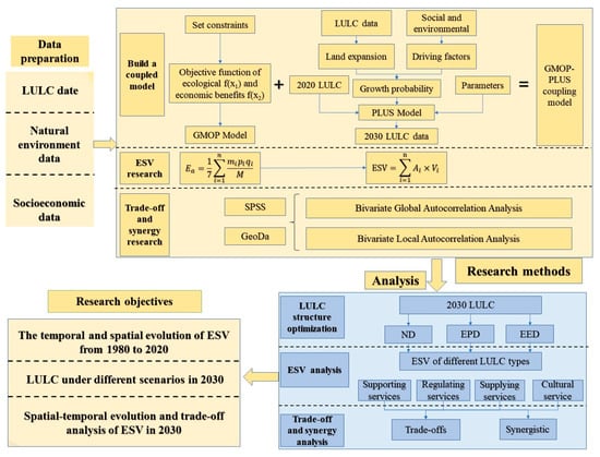 The research framework of this paper. LULC, Land use/cover; ESV, Ecosystem service value; ND, Natural development scenarios; EPD, Ecological priority development Scenario; EED, Balanced ecological and economic development; GMOP, Gray multi-objective optimization; PLUS, Patch-generating land-use simulation.