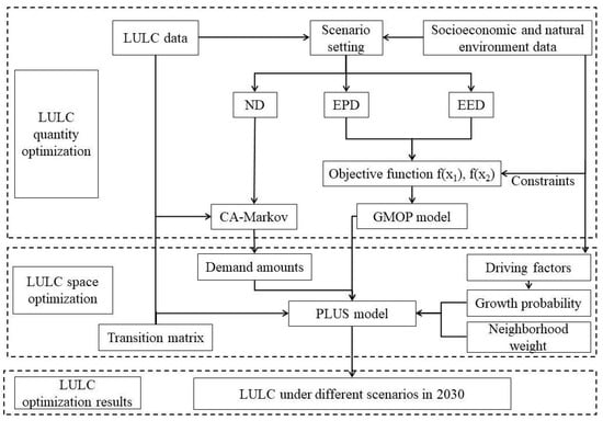 The construction and application of the GMOP–PLUS model involved three steps (Figure 3). First, we combined the LULC changes under historical conditions in the study area and the constraints on the social economy and natural environment. Three scenarios, ND, EPD, and EED scenarios, were set for the future, and CA-Markov and GMOP models were used to predict the LULC quantitative data under these three scenarios in 2030. Second, the spatial distributions of LULC under the three scenarios were simulated using the PLUS spatial optimization model. Finally, by integrating quantitative optimization and spatial optimization, we obtained the optimal structure of LULC within different scenarios in the study area in 2030.