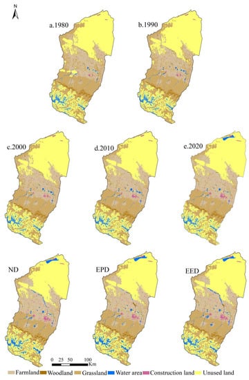 - The spatial LULC pattern in the Manas River Basin changed significantly. From 1980 to 2020, the areas of farmland, water area, and construction land tended to increase, whereas the areas of woodland, grassland, and unused land tended to decrease. From 2020 to 2030, under the ND scenario, the areas of farmland and grassland will generally remain stable, and the areas of woodland, water area, construction land, and unused land will increase or decrease; under the EPD scenario, a large amount of farmland and unused land will be converted into ecological land, where the area of ecological land will increase by 290.97 km2, but the expansion of construction land will be moderate; and under the EED scenario, the areas of grassland, water area, and construction land will tend to increase, where the area of construction land will reach 11.98%.