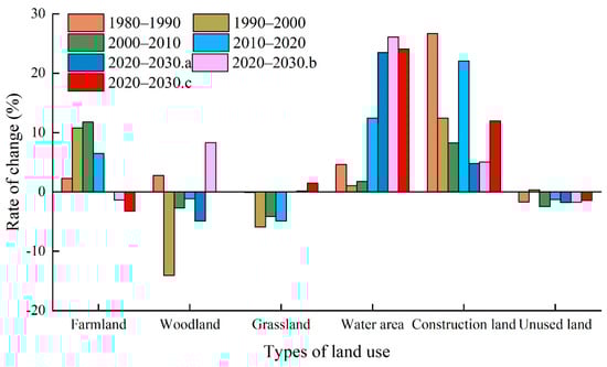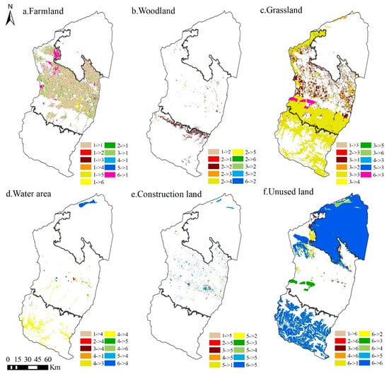 The total area of grassland decreased each year from 1980 to 2020; it was mainly transformed into cultivated land. According to the “Overall Plan for Land Use in Xinjiang Uygur Autonomous Region (2006–2020)” and the policy of “Returning Farmland to Grassland”, in order to accelerate the ecological replacement of grassland and strengthen the ecological protection of grassland, the grassland area should not be smaller than the current area. Combined with the development of the watershed, the grassland area should not exceed the pre-cultivation area in 1980, and thus: