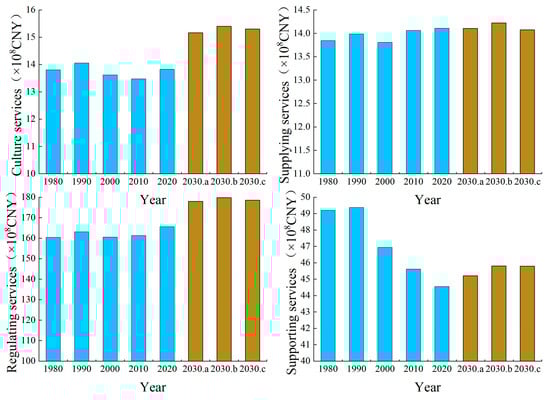 - From 1980 to 2020, the four individual ESV changes of supplying, regulating, supporting, and culture services in the Manas River Basin are shown as regulating services > supporting services > supplying services > cultural services. From 2020 to 2030, regulating services, supporting services, and cultural services will all tend to increase under the ND, EPD, and EED scenarios, but supplying services will increase or decrease under the three scenarios. From 1980 to 2030, in terms of primary ecosystem services, the ESVs for gas regulation, water conservation, and waste treatment will all tend to increase, whereas those for climate regulation, soil formation and protection, and biodiversity will decrease in a fluctuating manner.
