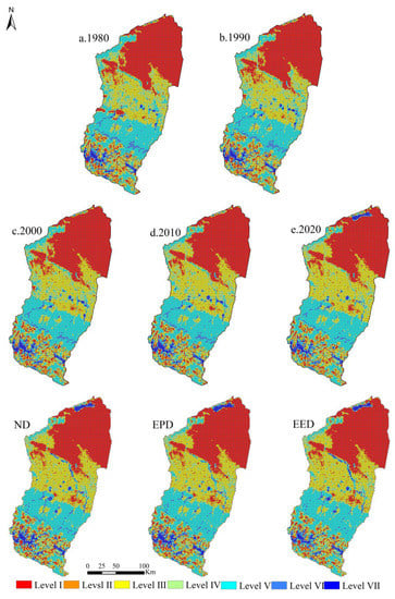 - The ESV in the Manas River Basin showed an increasing trend of fluctuation. From 1980 to 2020, the ESV in the study area increased slightly from 237.27 × 108 CNY to 238.10 × 108 CNY. From 2020 to 2030, the ESV in the Manas River Basin will increase significantly, with increases of 14.37 × 108 CNY, 17.08 × 108 CNY, and 15.58 × 108 CNY under the ND, EPD, and EED scenarios, respectively. The ESV in the Manas River Basin will increase most under the EPD scenario, followed by the EED scenario and then the ND scenario. The spatial differences in the ESV in the Manas River Basin were significant, but the spatial distribution was relatively consistent over the years, with high distributions in the south and low distributions in the north.