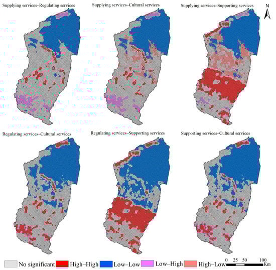 - In 2030, the trade-offs and synergies for various ecosystem services will be consistent in the Manas River Basin under the three scenarios with obvious significant synergistic effects, and the significant degree of synergetic relationship will be regulating services–cultural services > supplying services–supporting services >supporting services–cultural services > regulating services–supporting services > supplying services–regulating services > supplying services–cultural services. In terms of the spatial distribution, “low–low synergy” and “high–high synergy” clustering characteristics were obvious in the northern part of the basin and along the water system. Supplying services and the other three services mainly had “high–low trade-off” and “low–high trade-off” relationships in the plains and southern mountainous areas in the middle and north of the basin. The relationships comprising regulating services–supporting cultural, regulating services–cultural services, and supporting services–cultural services in this region were mainly scattered “low-low synergy” relationships, which were affected mainly by the distribution of ecological belts and human activities in the basin.