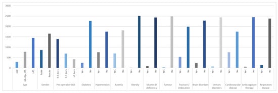 LOS | Gender | Age | Pre-Operative LOS | Diabetes | Hypertension | Obesity | Anemia | Vitamin D Deficiency | Tumor | Fracture/Dislocation | Brain Disorders | Urinary Disorders | Cardiovascular Disease | Respiratory Disease | Anticoagulant Therapy | ||