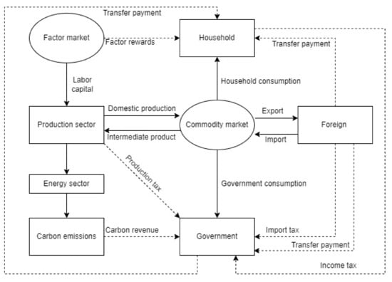 In this model, the carbon tax—which involves collecting carbon emissions in the production-end sector and energy products in the consumption end—is exogenous. Carbon tax revenue is calculated by multiplying carbon tax by carbon emissions, namely: