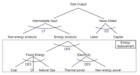 The fourth layer is the production structure of fossil energy products and power products. The energy products on the left side of Figure 2 are composed of coal, oil, and natural gas through the CES function, while the power products on the right are composed of thermal and new energy power.