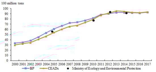Regarding the former, we must first solve the problem of basic carbon emissions data, as the existing carbon emissions database primarily includes data from the CEADs database, British Petroleum (BP), and the Ministry of Ecology and Environment (Figure 3). As the Ministry’s data is not sufficiently continuous, the two time-continuous CEADs and BP databases are more suitable for research. Additionally, the carbon emissions in 2005 (not included in the carbon sink) as calculated using the three databases were 5.4, 6.1, and 5.98 billion tons, respectively. In 2014, the 3 databases’ carbon emissions were 9.44, 9.24, and 10.28 billion tons, respectively. In 2017, the statistical carbon emissions for CEADs and BP were 9.34 and 9.3 billion tons, respectively. The numerical difference between these databases has significantly narrowed in recent years. Considering that the CEADs contains emissions data for 29 industries—which is convenient for a structural analysis and CGE model simulation—we ultimately chose the CEADs for our analysis. To avoid the uncertainty caused by the significant differences between the early carbon emissions data found in different databases, we selected the carbon emissions from the 2017 CEADs (9.34 billion tons) as our calculation benchmark.