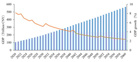 Current works on endogenous technological progress involving climate change and economic growth primarily considers R&D investments—or specifically, separates the R&D department—or conducts research with R&D investments as one element. This method not only creates spillover effects and inconsistency between social and private benefits, but also controls the development path of technological progress; thus, it is more suitable for short-term research []. Judging from a 40-year simulation of China’s developing carbon neutrality, technological progress has significantly impacted both carbon neutrality and economic growth. Therefore, a more suitable long-term endogenous technological progress model is needed to explore China’s decreased carbon emissions and path of development.