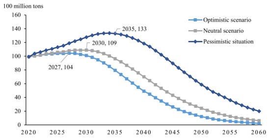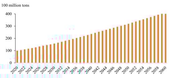 Regarding China’s carbon peak target, President Xi Jinping’s critical speech at the General Debate of the 75th United Nations General Assembly on 22 September 2020 indicated that China will enhance its nationally determined contribution. Moreover, the nation would strive to reach peak carbon dioxide emissions by 2030 and carbon neutrality by 2060, or the “30–60 dual carbon target”. Specifically, the carbon emission intensity in 2030 would decrease by more than 65% compared with that in 2005. Combined with the declining rate of carbon emissions intensity in that year compared with 2005, as recently announced by the State Council, the 2017 carbon intensity was 46% lower than that in 2005. It is estimated that carbon emissions in 2030 will reach 11.7 billion tons; after subtracting 910 million tons of carbon sinks, we predict that net emissions will reach 10.8 billion tons in 2030, which is an approximate median of the peak data calculated by Tsinghua University, the World Resources Institute, and other institutions.