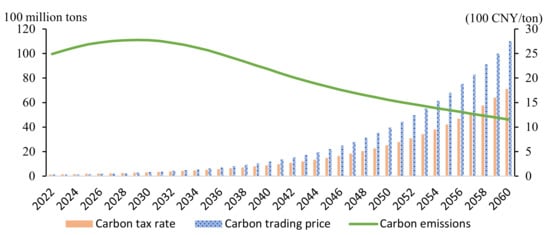 Most people intuitively feel that continuously increasing the level of carbon tax can fulfill China’s “30–60” goal. However, this dual carbon goal requires an incredibly high carbon price. As Figure 6 indicates, the carbon tax rate and carbon trading price would increase annually to 2000 CNY per ton, which would collapse China’s economy.