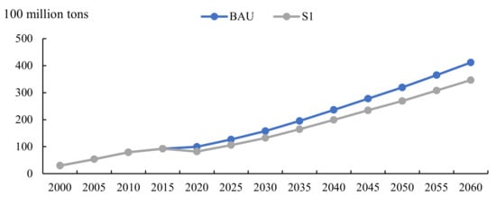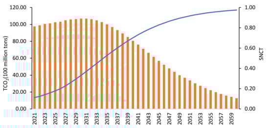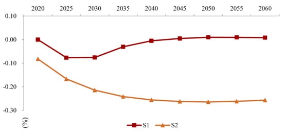 Compared with the “J”-shaped growth of carbon price under the S1 scenario, the carbon price under the S2 scenario shows an inverted “U”-shaped change with the development of climate-friendly technologies. The carbon price will rise year by year from the initial 10 CNY/ton to 140 CNY/ton in 2030, after which the carbon price will begin to decline steadily. As shown in Figure 11, when carbon prices peak, carbon emissions will also peak at 10.9 billion tons. The climate-friendly technology curve grows in an “S” shape, with a value of SNCT of 0.32 in 2030 and 0.99 in 2060. Investment, as an endogenous variable of the S-shaped technology curve, is the key to promoting technological progress. The model estimates that green technology R&D investment will account for about 2% of GDP, and it will increase year by year, helping R&D technology to cross the laboratory stage of the S-curve and use it for commercial applicato0-ions.