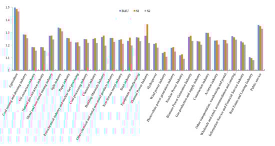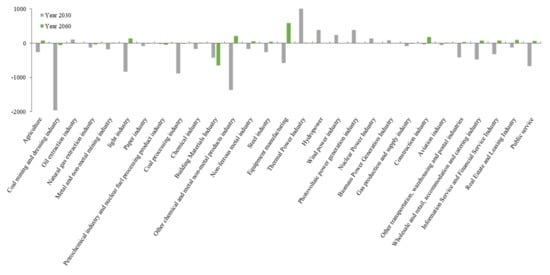 The industrial output significantly changed compared to the benchmark situation. Moreover, the output of non-thermal power generation, such as photovoltaic, hydro-, wind, and nuclear power will significantly expand in 2030, while coal processing and mining will significantly shrink. Further, the proportion of output among the agricultural, forestry, animal husbandry and fishery, public services, and light industries significantly decreased over time. The proportion of output for equipment manufacturing, real estate and leasing, and information and financial services increased annually (Figure 9 and Figure 10).