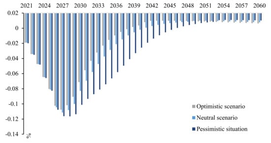 As Figure 13 illustrates, the GDP under the pessimistic technology outlook experiences a relatively large negative impact, and the overall carbon emission curve increases, with a later, higher peak. Optimistic prospects provide the opposite results, but it is difficult to achieve such rapid technological development.