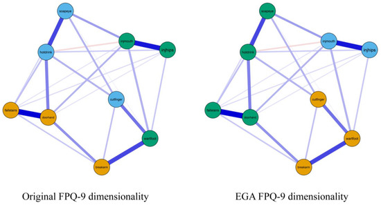 Model fit was evaluated with the Total Entropy Fit Index using Von Neumman entropy (TEFIvn). Lower values of the TEFIvn indicate better fit. We also employed traditional Confirmatory Factor Analysis (CFA) fit indices, such as the Root Mean Squared Error of Approximation (RMSEA) and Comparative Fit Index (CFI). We estimated factor models with weighted least squares and a mean- and variance-adjusted (WLSMV) test statistic. To evaluate RMSEA and CFI, we followed the latest recommendations in factor analytical research that CFI ≥ 0.900 indicates acceptable fit, while RMSEA ≤ 0.050 indicates good fit, and RMSEA ≥ 0.100 indicates unacceptable fit [28]. We then evaluated the original three-factor FPQ-9 structure and the EGA-identified structure. We also conducted model re-specifications based on modification indices (MI) and the standardized expected parameter change (SEPC).