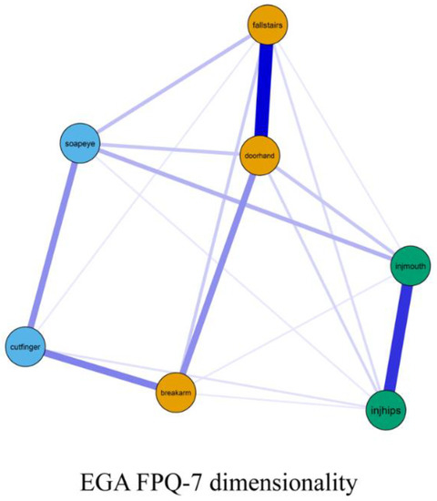 As seen from Figure 2, The EGA on the seven-item FPQ showed: dimension 1, composed of “fallstairs”, “doorhand”, and “breakarm” (orange nodes); dimension 2, composed of “soapeye” and “cutfinger” (blue nodes); and dimension 3, composed of “injmouth” and “injhips” (green nodes). These three dimensions corresponded, respectively, to the theoretical dimensions “Fear of Severe Pain”, “Fear of Minor Pain”, and “Fear of Medical/Dental Pain” from the original FPQ-9 questionnaire.