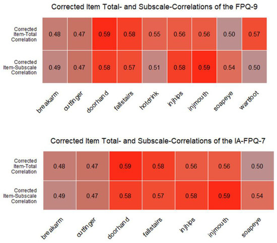 Corrected item total correlations of the FPQ-9 and IA-FPQ-7. Note: The saturation of the colour indicates the strength of the correlation (i.e., stronger shades of red indicate stronger correlations).