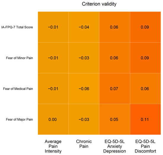 Regarding the analysis of criterion validity, the IA-FPQ-7 subscales and total score displayed weak and non-substantive correlations with average pain intensity, chronic pain, decrease in quality of life due to anxiety/depression, and decrease in quality of life due to pain, as seen in Figure 4.