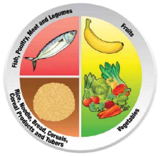 In order to relieve the increasing burden of NCDs and obesity in Malaysia, the Ministry of Health Malaysia introduced Malaysian Dietary Guidelines (MDG) in 1999 [9]. MDG is used as a reference or guide to encourage Malaysians to adapt a balanced diet that consists of various types of food in moderate amounts. Along with the formation of the MDG, the Malaysian Food Pyramid was also introduced in 1999. The Malaysian Food Pyramid is formed as a guide for choosing the type and amount of food for the public in promoting a balanced, moderate, and varied diet [10]. Malaysian Healthy Plate was produced in 2017 as a complementary tool for the Malaysian Food Pyramid. It shows the balanced single meal by visualizing the recommended amount of food to be eaten on a plate (Figure 1) [11]. The Malaysian Healthy Plate consumption of a quarter plate of grains, grains products, cereals products, and tubers; a quarter plate of fish, poultry, meat, and legumes; and half a plate of fruits and vegetables. In addition, plain water is suggested to replace the intake of sugary drinks [12].