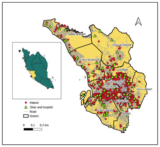 Distribution of pulmonary tuberculosis patients and public healthcare facilities in the state of Selangor, Malaysia.