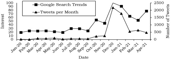 Twitter provides an official Application Programming Interface (API) to retrieve tweets. However, the API only returns tweets for the last seven days. Furthermore, accessing the premium API is costly. Therefore, we used the Twint package [26] in the Python language, which utilizes the search function of Twitter to retrieve tweets on a specific topic. Tweets are collected through a Python script or directly through the command-line interface in Windows or macOS. Using Twint, we searched for the term “halal vaccine” and limited the timeline between 1, January, 2020 and 30, April, 2021. Figure 2 shows the number of tweets in the period above. In addition, we looked up the trend thanks to Google Trends [27], which shows interest in a topic over time in Google services such as search, YouTube, etc.