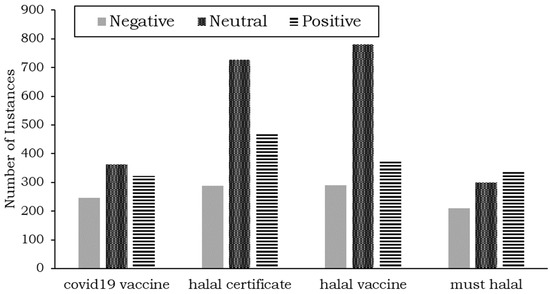 Based on Figure 6, the “COVID-19 vaccine,” “halal certificate,” and “halal vaccine” topics are associated with neutral sentiments more than with positive or negative ones. This shows that the users are still unsure about these topics since they are relatively new. Additionally, after neutral sentiments, positive sentiments are more prevalent than negative ones for all three topics. Specifically, the difference between positive and negative sentiments is more significant for the topic of the halal certificate than for other topics. This shows that although most users have a neutral opinion about this topic, many welcome the concept of a halal certificate for the vaccine.