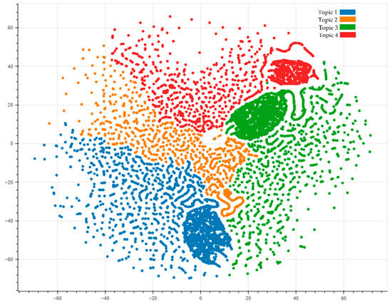 Figure 5 shows four topics in the Twitter dataset. A color represents each topic. We can see that the words are grouped into topics and form a cluster. We then label each topic and calculate sentiment analysis of each topic, which is shown in Figure 6.