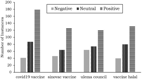 As shown in Figure 8, the topics are “COVID-19 vaccine,” “Sinovac vaccine,” “ulema council,” and “vaccine halal”. All topics show that positive sentiments are more prevalent than neutral and negative sentiments.