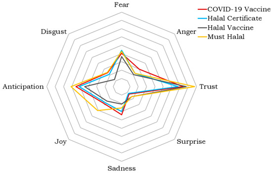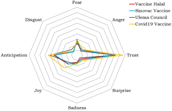 Interestingly, the results show that trust is the most frequently detected emotion in the tweets. The second emotion is anticipation, followed by fear. Sadness is the fourth emotion in the “COVID-19 vaccine” and “halal certificate” topics, while joy is the fourth emotion in the other two topics.
