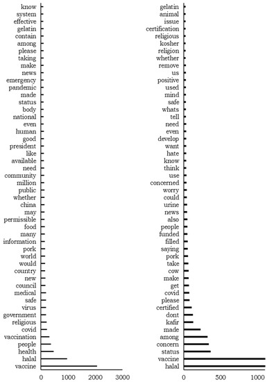 Figure 11 shows that in Facebook posts, users are most concerned about the religious aspect of the vaccines and whether they are halal. Specifically, they mention “pork” and “gelatin” and ask for more information on the contents of the vaccines. In addition, we find “government” and “president” in the top-50 list. Considering that most of the Facebook pages belong to news and government agencies, this shows the action of governments towards ensuring that the vaccines are indeed halal. In this regard, we can point to the most shared post about the Indonesian government’s collaboration with an institution in London to develop a vaccine and make sure it follows the Islamic guidelines.