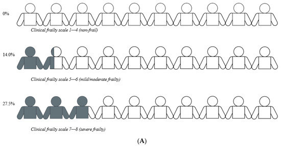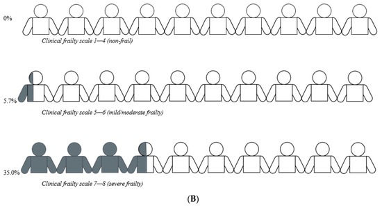There were relevant differences between proportions of patients with a poor outcome and patients without a poor outcome depending on the frailty status. None of the non-frail patients had a poor outcome. Among the mildly/moderately frail patients, 49 (14.0%) had a poor outcome, and among the severely frail patients, 22 (27.5%) had a poor outcome (Figure 1A).