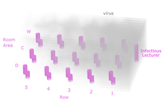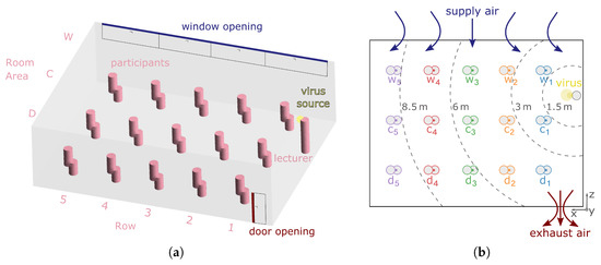 It is assumed that there are 16 persons (one infectious lecturer and 15 susceptible persons) in a room with a floor area of and a ceiling height of . Each person has a radius of at least around themself, in which no other person is present. Consequently, it is considered that general distance rules are followed; thus, the spread mechanism is based exclusively on airborne transmission. According to Figure 1b, the rows are numbered from 1 to 5 in the x-direction during evaluation, whereas row 1 is closest to the lecturer. In the z-direction, the position of the seats is described as being close to the window (w), close to the door (d), or referred to as the middle area in between, denoted as centre (c).