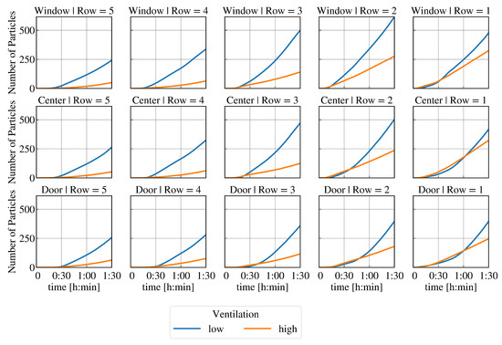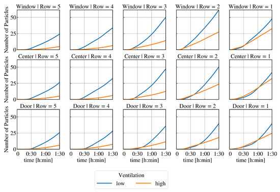 After , several conclusions can be made from the resulting virus load at each seat (see Figure 4 and Figure 5) at different ventilation levels: The relative reduction in the number of particles after is lowest in the first row, followed by the second row compared to the other rows. The largest absolute impact of high ventilation in each row can be detected at the window seat. The order of seats from highest to lowest resulting virus load changes with respect to high and low ventilation. It can be assumed that the type and direction of indoor airflow, such as cross-ventilation, displacement ventilation, mixed ventilation, etc., has a major influence on the temporal and spatial spread of SARS-CoV-2.
