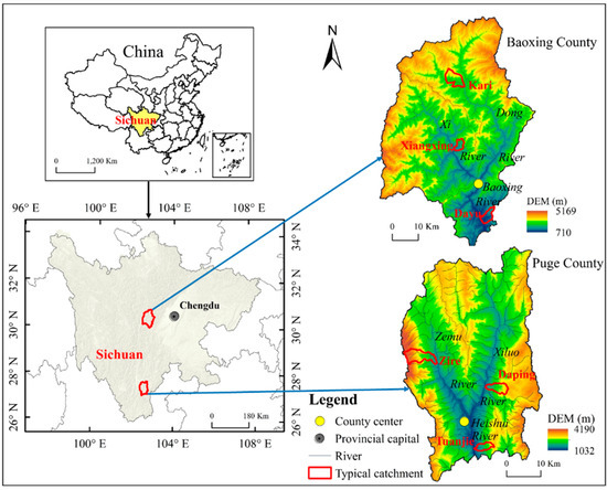 Baoxing county is located at 102°28′–103°02′ E and 30°09′–30°56′ N, has an area of 3144 km2, had an estimated population of 59,000 inhabitants and 21,500 households at the end of 2014, and the population density was approximately 19 per square kilometer [6]. Puge county is located at 102°26′–102°46′ E and 27°13′–27°30′ N, has an area of 1905 km2, had an estimated population of 199,000 inhabitants and 56,000 households in 2014, and the population density was approximately 104 per square kilometer [7]. Baoxing is one of the most important panda habitats in China, and is one of the world’s 25 ‘biodiversity hotspots’ [25]. Puge is located in the upper reaches of the Jinsha River Basin, and faces extreme soil water erosion and multiple natural hazards [26] (Figure 1). There are challenges to effective ecological and environmental restoration in both counties.