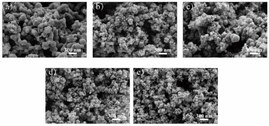 Figure 1 shows the surface morphology of nZVI and S-nZVI materials with different Fe/S molar ratios. Figure 1a shows spherical nZVI particles with relatively uniform sizes (50–200 nm) that aggregate into chains due to electrostatic and magnetic forces. The S-nZVI contained spherical and amorphous structures as shown in Figure 1b–e. By comparing S-nZVI materials with different Fe/S ratios, the spherical structure continuously decreased, and the main structure gradually changed from a relatively regular sphere to an irregular amorphous structure as sulfur was added. These changes illustrated that sulfidation increased material dispersion and improved its specific surface area, which could be related to the formation of an FeSx layer on the nZVI surface.