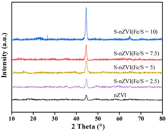Figure 2 shows XRD spectra of nZVI and S-nZVI with different Fe/S ratios. The characteristic diffraction peaks at 2θ = 44.6° and 65.0° corresponded to the (110) and (200) faces of Fe(0) (PDF#00-006-0696), respectively. On the other hand, there was no obvious iron-oxide peak, which indicated that the degree of oxidation was relatively light during the preparation and preservation of the material. Additionally, S-nZVI had a strong diffraction peak at the same position, which indicated high crystallinity Fe(0) in S-nZVI, and that sulfur introduction promoted the formation of Fe(0) crystals, and the peak intensity increased with the increase of Fe/S ratio.