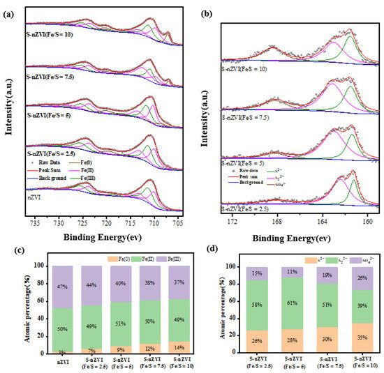 XPS spectra of nZVI and S-nZVI materials with different Fe/S ratios: (a) XPS spectrum of Fe2 p; (b) XPS spectrum of S 2p; (c) Fe levels in different valences; (d) S levels in different valences.