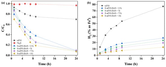 Figure 4 shows the performances of nZVI and S-nZVI materials with different Fe/S ratios (Fe/S = 2.5, 5, 7.5, and 10) in TCE degradation. As shown in Figure 4a, the 24 h TCE-removal efficiency of nZVI was 30.2%, while that of S-nZVI (Fe/S = 10) exceeded 92.6%, which indicated that nZVI did not degrade TCE, while the dechlorination of S-nZVI improved significantly. Meanwhile, the removal efficiency of TCE increased as the Fe/S molar ratio increased. To confirm whether Fe (not S) degraded TCE in S-nZVI, Na2S was mixed with TCE to monitor its degradation effect. As shown in Figure 4a, Na2S did not degrade TCE. A quantitative test of H2 in the crimp-top vial was performed (Figure 4b) to explore how much Fe(0) was used for H2 evolution. That test indicated that the side reaction of H2 evolution consumed 77.0% of the initial Fe(0) in nZVI. However, only 12.8% of the initial Fe(0) was consumed for H2 evolution in the S-nZVI at an Fe/S ratio of 10. This indicated that sulfidation greatly inhibited side reactions so that a large amount of Fe(0) could react fully with TCE. Some researchers reported that H2 evolution mainly occurred in the iron oxide layer rather than the FeSx layer, while the main reaction site for TCE occurred in the FeSx layer [30,31]. Since the FeSx layer had strong electrical conductivity [32], electron transfer from the surface of the FeSx layer was used for TCE degradation. This was the reason S-nZVI simultaneously suppressed H2 evolution and promoted TCE degradation.