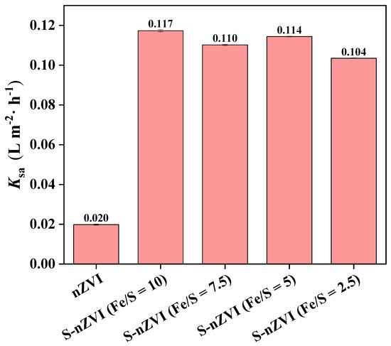 An evaluation of degradation rate constants for nZVI and S-nZVI materials was conducted and is shown in Figure 5. Rate constants were obtained by fitting the 24 h removal-efficiency curve for TCE using pseudo-first-order kinetics. As shown in Figure 5, the incorporation of sulfur into nZVI greatly increased the degradation rate constant, which was likely due to the FeS shell of S-nZVI improving electron-transfer efficiency. The degradation activity of S-nZVI maximized for Fe/S = 10, with a rate constant of 0.117 L/(m2·h). However, when the Fe/S molar ratio varied between 2.5–10, the rate constant for S-nZVI materials changed slightly. This may be related to excess Fe(0) in the S-nZVI system, where the initial TCE concentration was as low as 10 ppm.