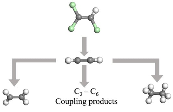 Overall, dechlorination of TCE occurred via β-elimination through chloroacetylene, followed by hydrogenolysis of chloroacetylene to acetylene, which agreed with previous reports [23,33]. A larger dose of S-nZVI produced ethylene and ethane via hydrogenation of acetylene, and may generate C3-C6 hydrocarbons via the polymerization of acetylene (Figure 7).